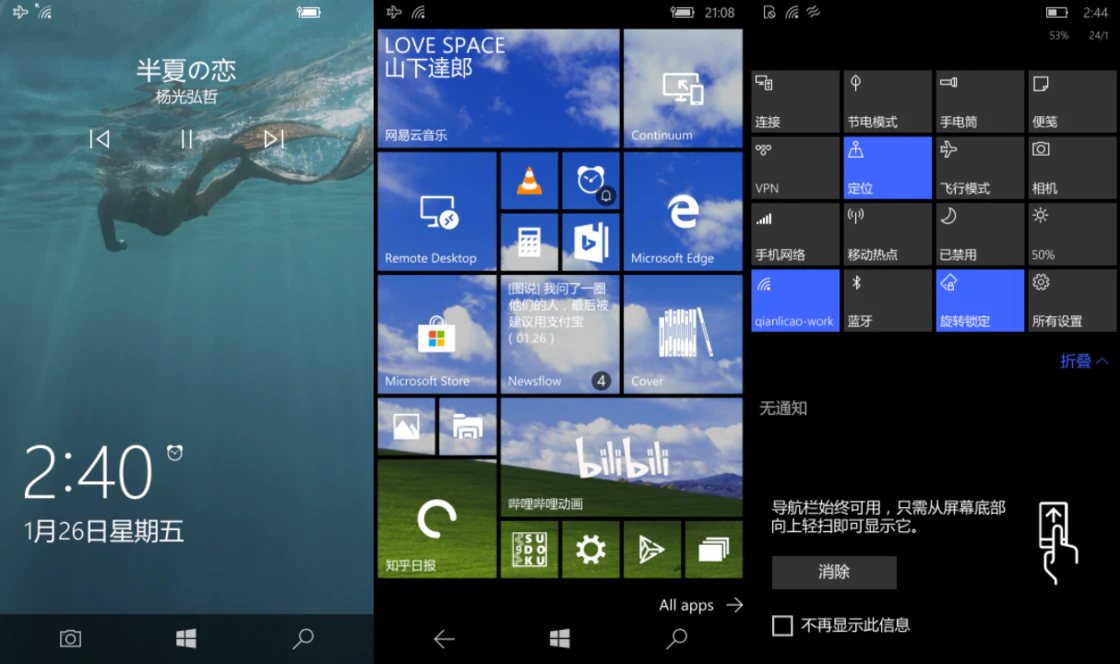 锁屏、桌面动态磁贴、下拉控制菜单栏