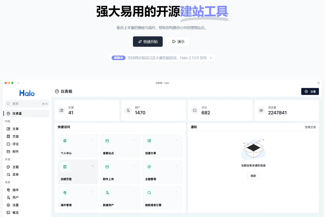 - 开箱即用的使用体验,相比较生成式博客工具,你无须关心图床、编辑器、生成、主题配置文件、邮件通知插件等等,Halo 安装好了,就能立马使用。