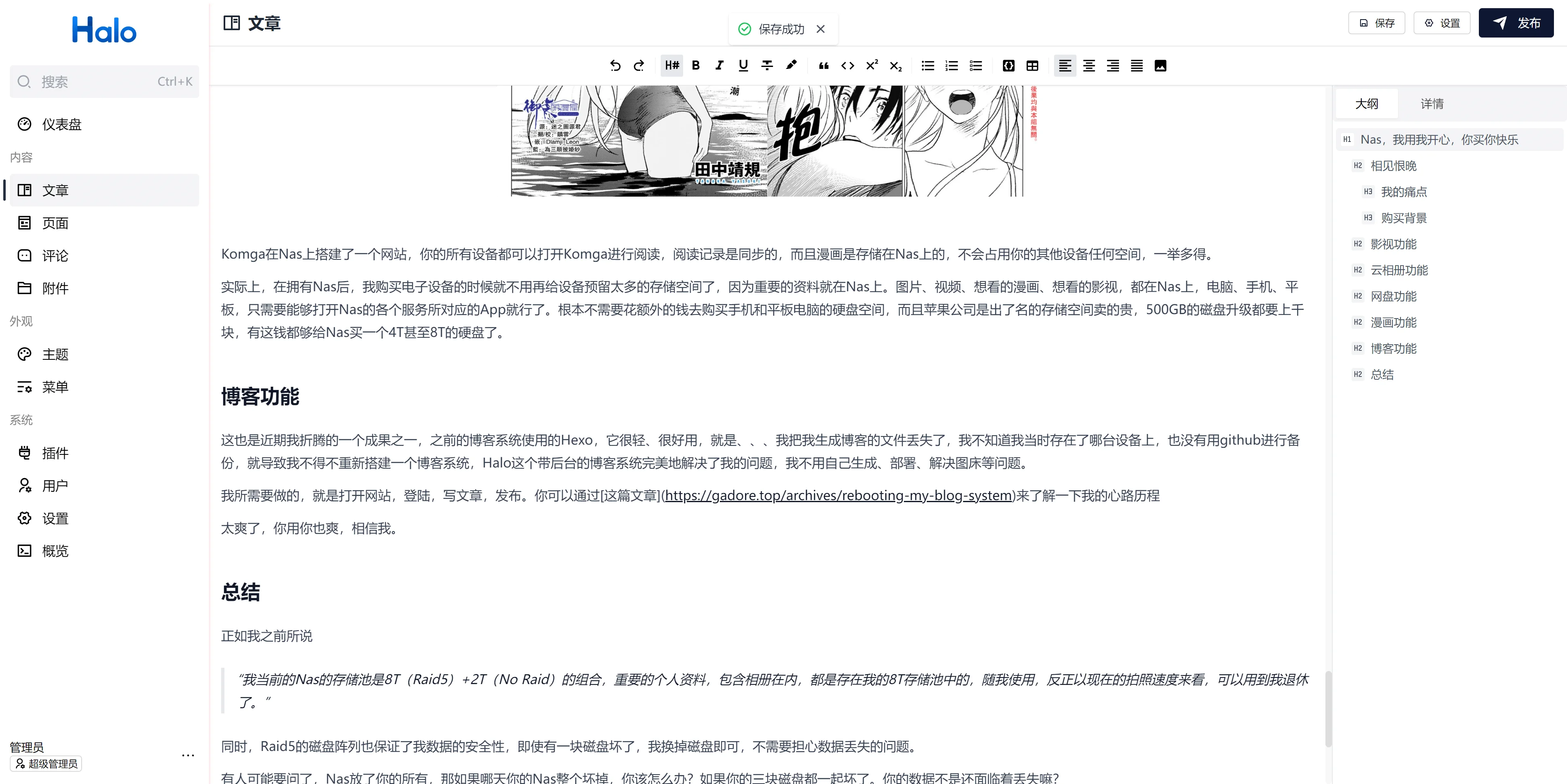- 开箱即用的使用体验,相比较生成式博客工具,你无须关心图床、编辑器、生成、主题配置文件、邮件通知插件等等,Halo 安装好了,就能立马使用。